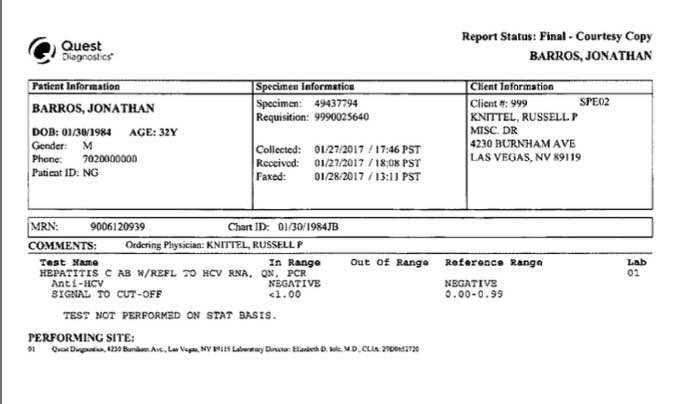 La contraprueba realizada al mendocino Jonathan Barros, materializada esta tarde en la ciudad de Las Vegas tras el positivo del viernes por Hepatitis C, en la previa de su combate ante Lee Selby por el título mundial pluma FIB que este posee y que debía desarrollarse hoy en el MGM Grand, arrojó un resultado negativo.Oficialmente, los estudios que se realizó el cuyano en los laboratorios de análisis clínicos Quest Diagnostics, determinaron que no hay infección por Hepatitis C, tal como se había manifestado el viernes en los análisis que se realizaron días antes del pesaje oficial, montados por la Comisión Atlética del Estado de Nevada (NSAC), que inmediatamente determinó la cancelación del pleito.