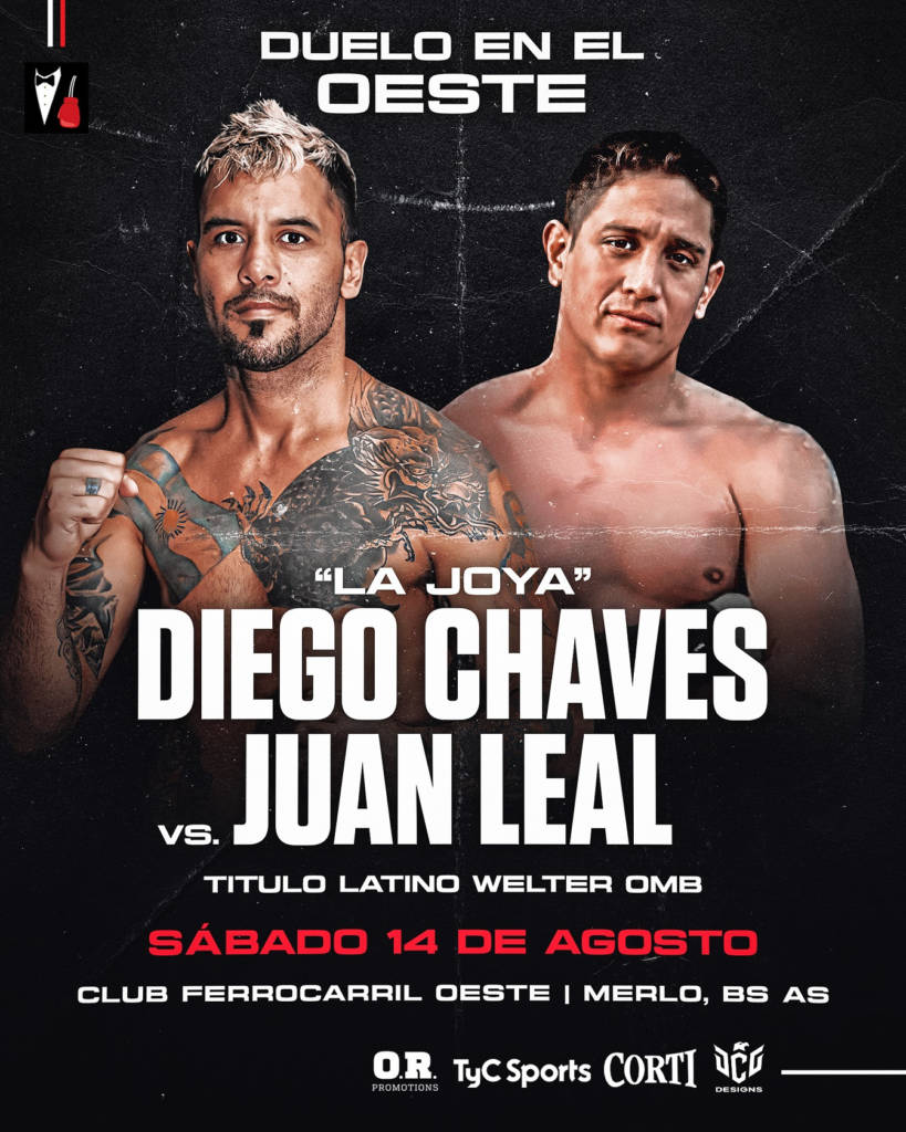 En el combate estelar de la noche denominada “DUELO EN EL OESTE”, estará en juego el título latino wélter, versión Organización Mundial de Boxeo (OMB), que defenderá por primera ocasión el bonaerense de Florencio Varela y también monarca nacional de la categoría, Juan Hernán Leal (12-1-0, 4 KO), siendo su retador el consagrado ex campeón mundial wélter AMB, Diego “La Joya” Cháves (28-6-1, 23 KO). El combate se disputará a la distancia de diez asaltos de 3×1.