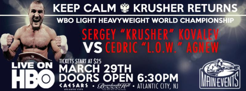 March 29 features the WBO Light Heavyweight World Title showdown between Sergey “Krusher” Kovalev (23-0-1, 21KOs) and Cedric Agnew (26-0-0, 13 KOs) from the Ballroom at Boardwalk Hall in Atlantic, City, NJ. The telecast will begin live on HBO Boxing After Dark at 10:00 PM ET/PT with the Thomas Dulorme vs. Karim Mayfield co-feature. The event is presented by Main Events in association with Caesars Atlantic City. Tickets are on sale now through TicketMaster online at www.ticketmaster.com or via phone (800) 736-1420. Fans can also contact Main Events for tickets at (973) 200-7050. Ticket prices are $26, $51, $77 and $152. Doors will open at 6:30 PM ET. Undercard bouts will be announced shortly.