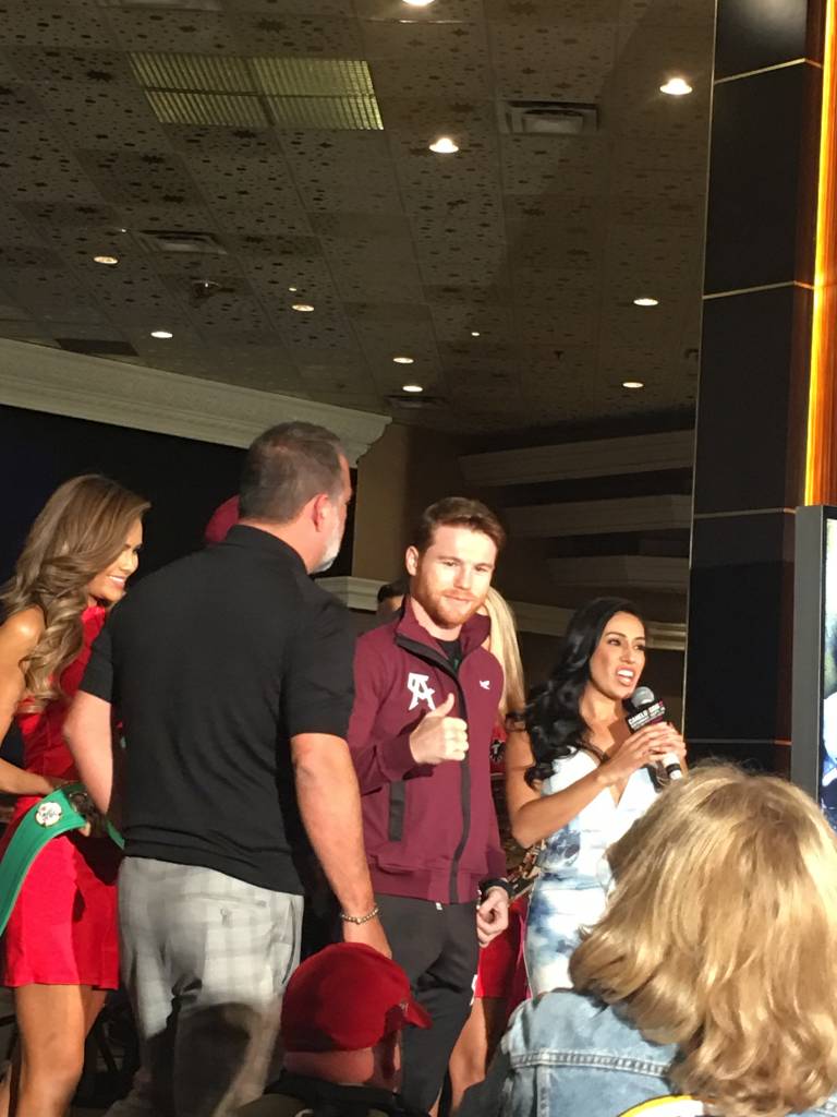 Y el Mariachi del Sol empezó a sonar de ton a son con México Lindo y Querido y subió al foro Saúl Álvarez con lente oscuro y después agradeció el apoyo de sus miles de admiradores y dijo que entrena duro para su gente que lo inspira para seguir haciendo historia en el boxeo, y dijo que todas las criticas lo han motivado positivamente y que va a demostrar claramente todo lo que ya trae de planta en la mente y concluyó: