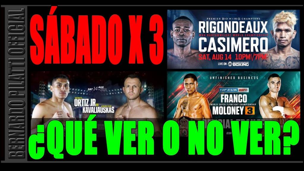 Habrá mucho boxeo este fin de semana y la atención está centrada en las peleas titulares de las tres carteleras que veremos por DAZN, ESPN y Showtime. Regresa Vergil Ortiz Jr. para una dura prueba ante Egidijus Kavaliuskas, un lituano que solo a perdido contra Terence Crawford, Andrew Moloney y Joshua Franco se encuentran por tercera vez consecutiva en una pelea de donde saltarán chispas y la incógnita sobre lo que pueda o no pueda suceder en John Riel Casimero vs. Guillermo Rigondeaux.