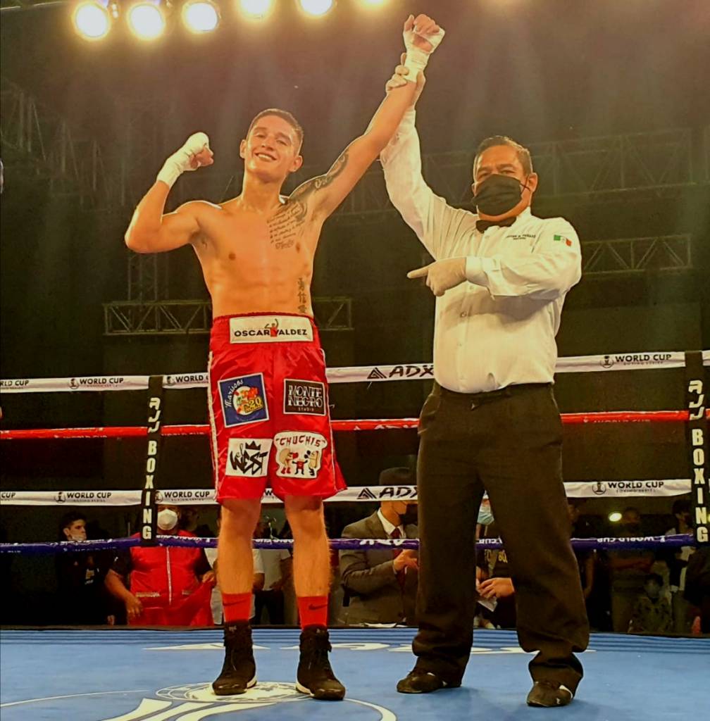 El carismático ‘Peluchín’ sumó su décimo triunfo sin derrota en el profesionalismo, al noquear en apenas un asalto al guasavense Jairo ‘Zorrito’ Miranda con un certero golpe al cuerpo que provocó que ya no pudiera recuperar la vertical y quedara declarado fuera de combate por el tercero sobre la superficie.