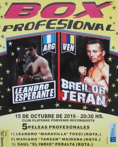 En esta oportunidad, el Club Deportivo Platense Porvenir de la ciudad de Reconquista, provincia de Santa Fe, República Argentina, albergará como tope central la disputa del título latino supergallo —versión plata— perteneciente al Consejo Mundial de Boxeo (CMB), entre el bonaerense de la localidad de Sarandí, Leandro David “el León” Esperante (27 años / 15-5, 12 KO), y el experimentado venezolano Breilor Jesús “Zulanito de Oro” Terán (31 años / 15-14-1, 8 KO).
