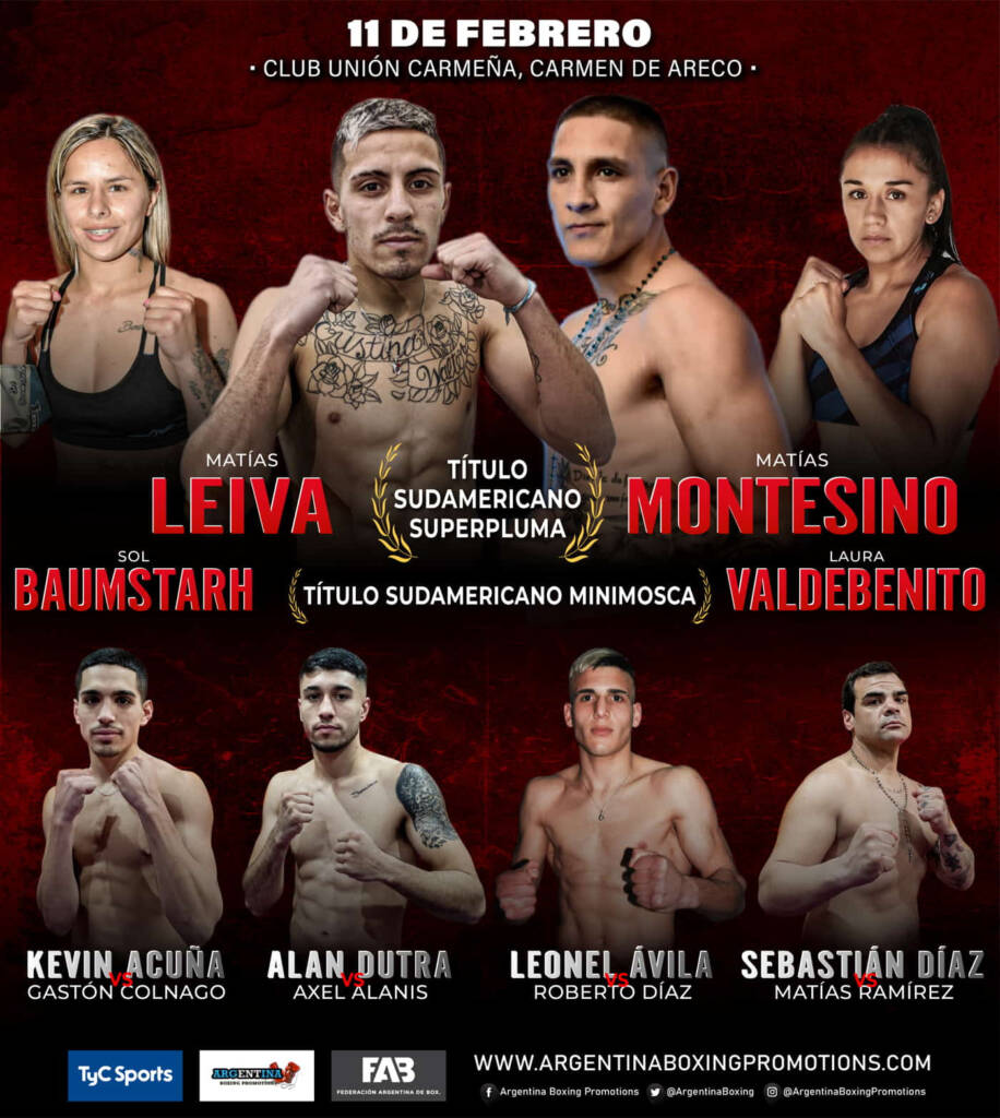 Dos peleas titulares, consolidados campeones y jóvenes figuras, protagonizan una nueva jornada de la mano de Argentina Boxing Promotions por TyC Sports. El estilista marplatense Matías “El Distinto” Leiva se enfrentará al chubutense Matías Montesino, intentando defender por tercera ocasión su título sudamericano superpluma, en uno de los combates estelares de la velada que se desarrollará este sábado, 11 de febrero, en el Club Unión Carmeña, de Carmen de Areco, provincia de Buenos Aires, Argentina, en una nueva producción de Argentina Boxing Promotions, de Mario Margossian, que será televisada en vivo a través de TyC Sports y TyC Sports Play a partir de las 23:40, para Argentina y toda América en su ciclo Boxeo de Primera. TyC Sports Play iniciará a las 21:20 con combates complementarios.