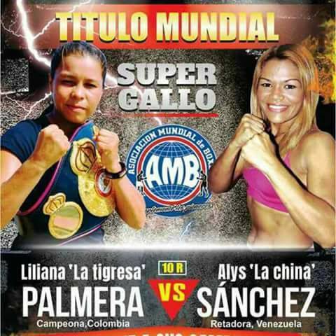 Por primera vez defenderá el título Regular Supergallo AMB, la notable pugilista colombiana Liliana Palmera. Su rival será la valiente peleadora venezolana Alys Sánchez. Ambas fajadoras se las verán este sábado 5 de agosto en Barranquilla, Colombia. Esta será la segunda vez que estas peleadoras se enfrentan por una corona AMB. El 6 de febrero de 2015 disputaron el título Mundial Interino de las Supergallos, en el Coliseo “Mario De León” de Cereté, Colombia. y en el cual la Palmera retuvo el título por Decisión Dividida.