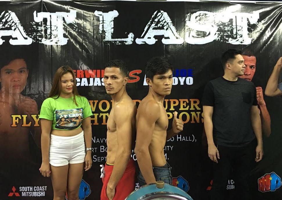 El campeón supermosca (115 libras) de la Federación Internacional de Boxeo (FIB), McJoe Arroyo, y su retador, el filipino Jerwin Ancajas, no tuvieron problemas con el peso para su encuentro de este sábado, 3 de septiembre, que se efectuará en Fort Bonifacio en Taguig City, Manila, Filipinas.