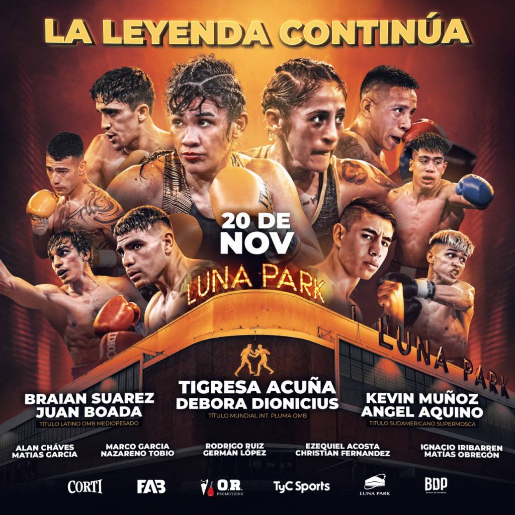 OR PROMOTIONS, una de las promotoras más reconocidas de América Latina por haber consagrado a 40 campeon@s mundiales, tiene el orgullo de anunciar y promover el tan ansiado regreso del boxeo al emblemático estadio porteño LUNA PARK, el próximo SÁBADO 20 DE NOVIEMBRE a las 20:00 hs, La misma será transmitida en exclusiva por TYC SPORTS a partir de las 22:00 y por streaming en TYC SPORTS PLAY desde las 20:00 a través en su tradicional ciclo “BOXEO DE PRIMERA”, en vivo para Argentina y todo el continente americano.