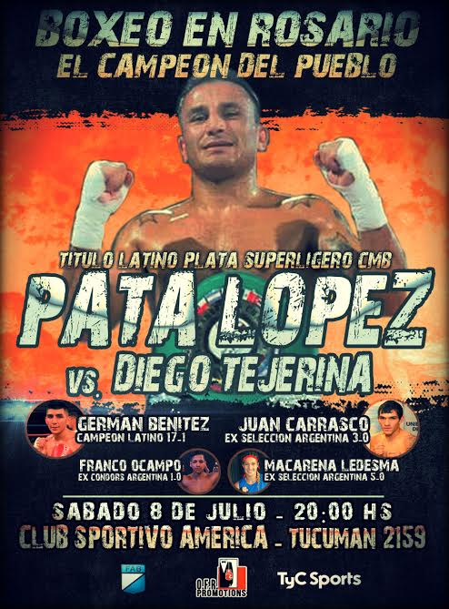 En el tope estelar de la noche, el rosarino Rubén Darío “Pata” López (11-9-3, 5 KO), defenderá por primera ocasión su título latino superligero/63,503 kg del Consejo Mundial de Boxeo (CMB), en este caso frente al noqueador oriundo de la provincia de Salta y otrora retador regional y nacional, Diego Daniel Tejerina (10-3-3, 9 KO), en combate pactado a la distancia de diez asaltos de 3×1.