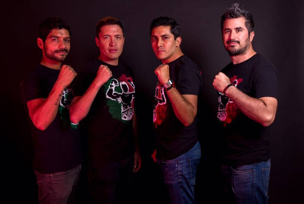 (De izquierda a derecha) los actores Christian Vázquez y Armando Hernández, y el promotor Alejandro Reyes junto con el matchmaker Enrique Rodríguez
