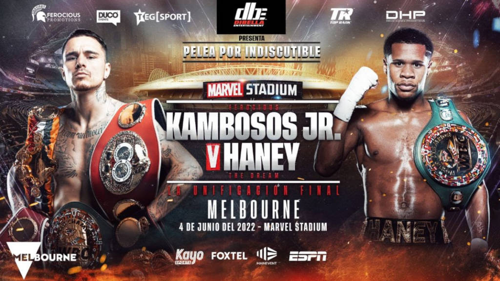 “Desde el 2017, cuando George y yo comenzamos a trabajar juntos, expresó su deseo de pelear en el extranjero para lograr su objetivo de ganar el título mundial de peso ligero”, dijo Peter Kahn, manejador de Kambosos. “Dijo que traería el cinturón, en este caso, cinturones, de regreso a Australia y llenaría un estadio para su primera defensa. Cinco años después, eso es exactamente lo que está haciendo el 4 de junio cuando enfrente a Devin Haney por el campeonato mundial indiscutible de peso ligero en Melbourne, Australia”.