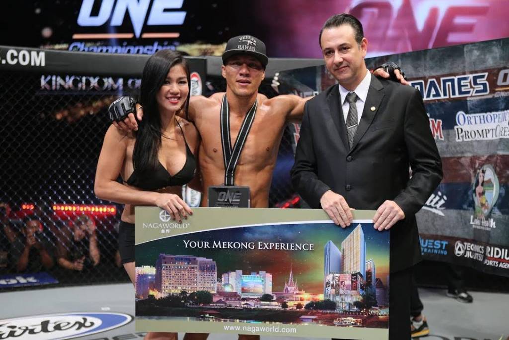 Cambodian judo expert Meas Meu collected another impressive victory in the ONE Cage with a first-round TKO stoppage of bantamweight Chan Sam Art. Meas started out hard and fast to stagger his rival, at one point picking Chan up and dumping him onto the canvas before dominating the ground exchange with a barrage of blows. The referee jumped in to wave off the contest shortly after.