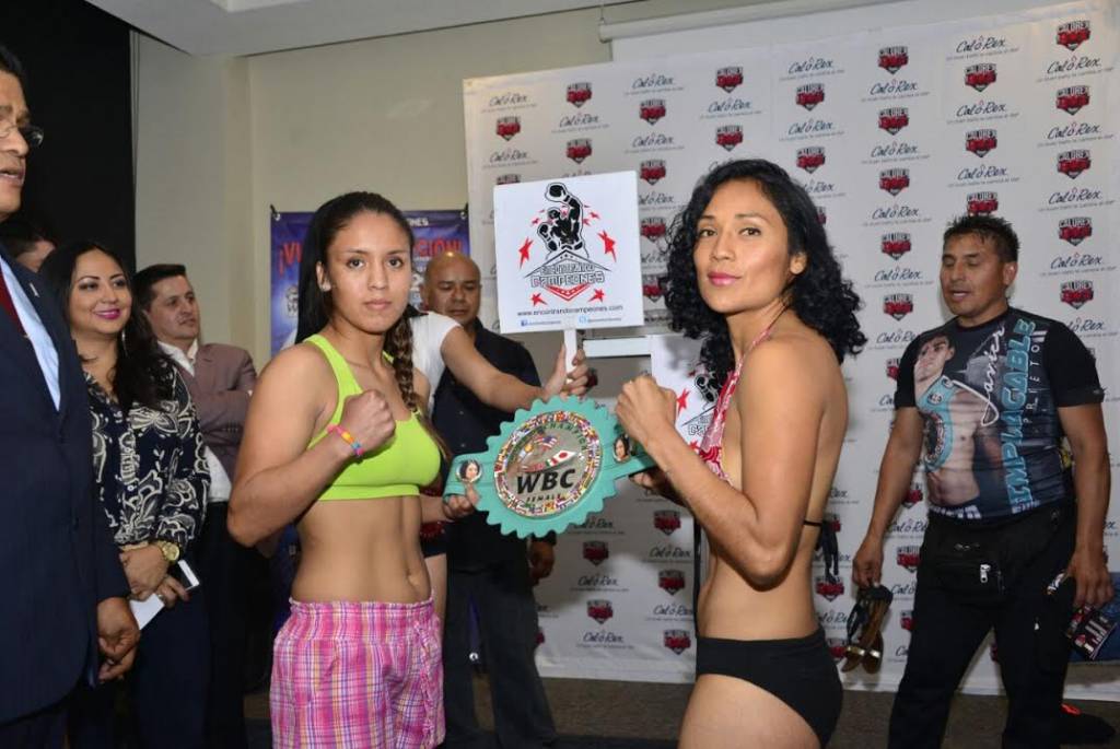 La primera en subir a la báscula fue la soberana Plata WBC de las 115 libras (52.163 kilogramos), quien detuvo el fiel de la báscula en 51.500 kilogramos, mientras que su desafiante lo hizo en un peso de 51.000 kilogramos, quedando ambas en condiciones para contender por la diadema que avala el Consejo Mundial de Boxeo.