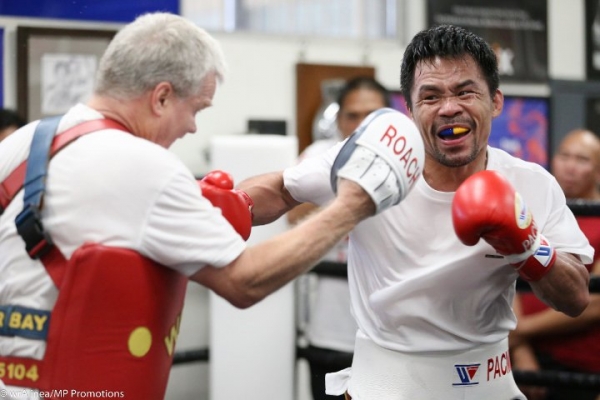 Como ha sido constante en toda su etapa de preparación en Los Ángeles, California, Pacquiao lució sus condiciones para este choque contra Thurman, luciendo una gran condición física a sus 40 años de edad.