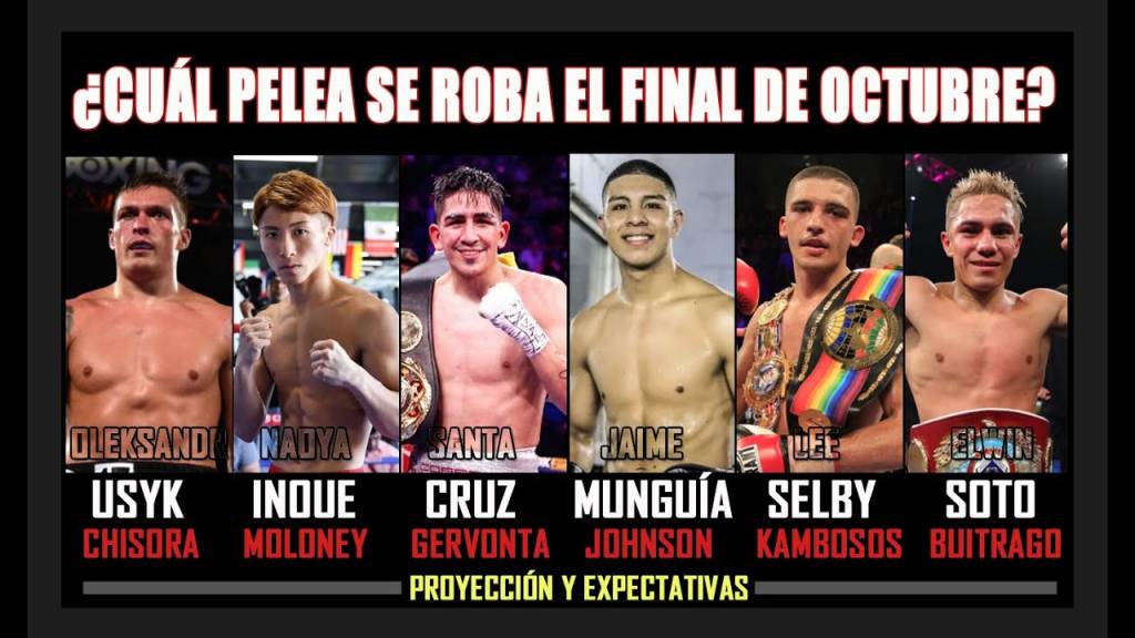 Todas con suficientes alternativas como para acompañar el desempeño de los rivales, estar atentos a su resultado e imaginar lo que viene después para los vencedores. Leo Santa Cruz, vs. Gervonta Davis, Oleksandr Usyk vs. Dereck Chisora, Naoya Inoue vs. Jason Moloney, Jaime Munguía vs. Tureano Johnson, Lee Selby vs. George Kambosos Jr. y Elwin Soto vs. Carlos Buitrago.