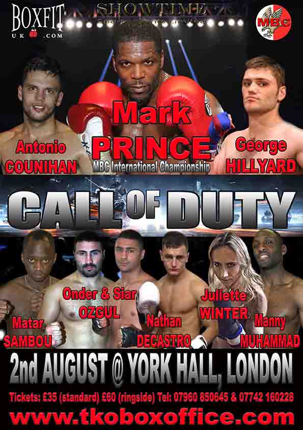 Mark Prince, versus a yet to be named opponent for the vacant MBC International Cruiserweight headlines the Shyam Batra SSE Promoted CALL OF DUTY event at York Hall in Bethnal Green, London on Saturday 2nd August 2014.