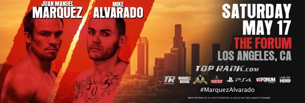 Promoted by Top Rank®, in association with Zanfer Promotions, Márquez Boxing, PS4 and Tecate, remaining tickets to Márquez vs. Alvarado, priced at $400, $250, $150, $75 and $35, can be purchased at the Forum box office, all Ticketmaster outlets, Ticketmaster charge by phone (800-745-3000), and online at www.ticketmaster.com or www.fabulousforum.com