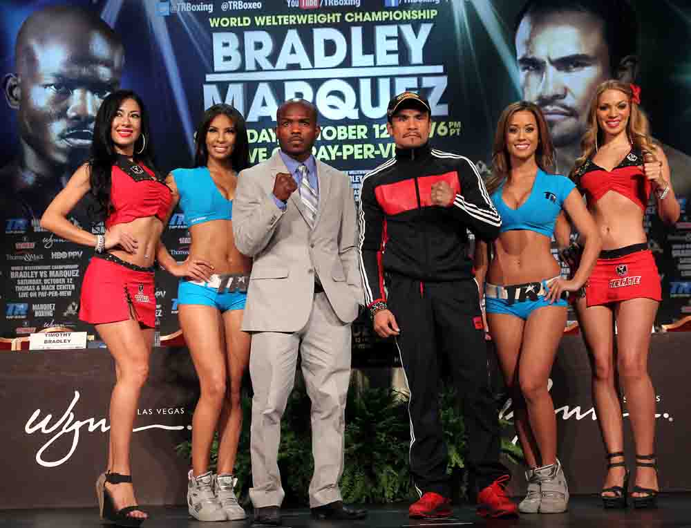 Juan Manuel Márquez y Timothy Bradley tienen los argumentos para ofrecer una gran pelea y tener aspiraciones reales a la victoria y lo reafirmaron en la última conferencia de prensa que sostuvieron hoy en las Vegas para el combate de este sábado en la Arena Thomas and Mack Center en una co promoción de Top Rank y Zanfer y que será transmitida por HBO y en México por Azteca 7, La Casa del Boxeo. Las apuestas están 1-1, es un duelo parejo, aunque la velocidad puede ser un facto clave a favor de Bradley.