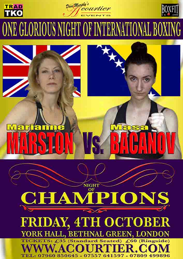 Marianne Marston versus Masa Bacanov, will feature on the Dave Murphy Acourtier Events promoted ‘NIGHT OF CHAMPIONS’ event, headlined by Michel Trabant vs TBA and Jennifer Retzke versus Angel McKenzie World title clashes, at York Hall in Bethnal Green, London on Friday, 4th October 2013.