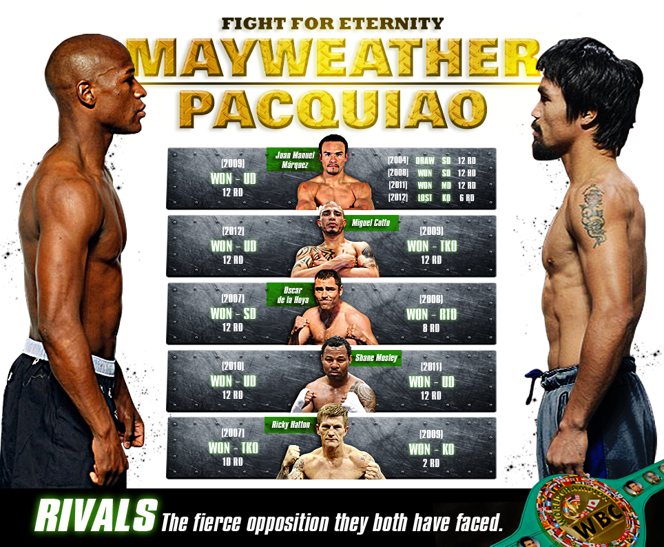 Pacquiao (57-5-2, 38 KOs) y Mayweather (47-0, 26 KOs) han prometido que será la pelea del siglo, donde los dos mejores pesos welter actuales estén arriba del ring.