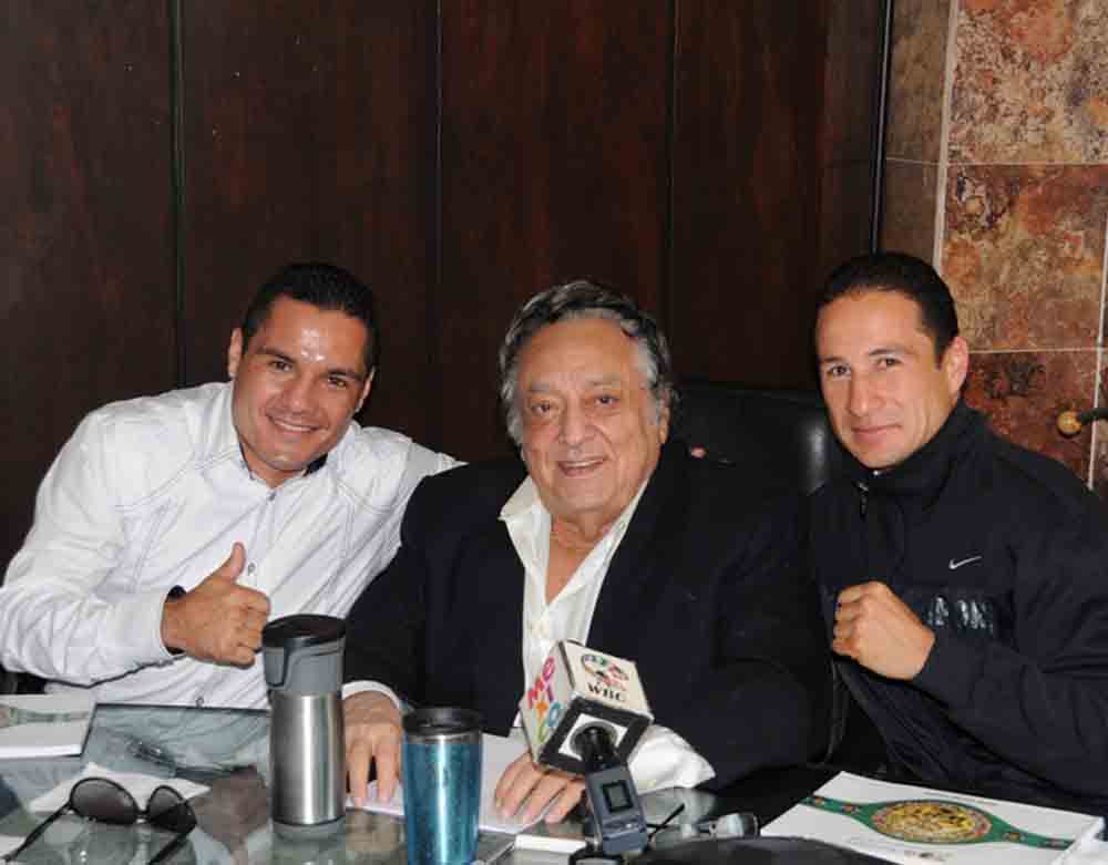 A casi dos meses de estrenar el cetro mundial superpluma del Consejo Mundial de Boxeo, el mexiquense Gamaliel Díaz (derecha) acudió a las oficinas de Génova 33 para entrevistarse con José Sulaimán (centro) –presidente del C.M.B. y anunciar su defensa del próximo 8 de abril, en suelo japonés ante el local Takashi Miura.