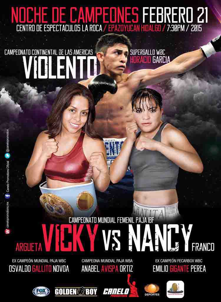 Interesante función que reúne todo para tornarse explosiva, el sábado venidero en “Noche de Campeones” en el Centro de Espectáculos La Roca de Epazoyucan, Hidalgo, donde la mexiquense Vicky Argueta jugará su título mundial de peso paja de la Federación Internacional de Boxeo con la jalisciense Nancy “Chatita” Franco.