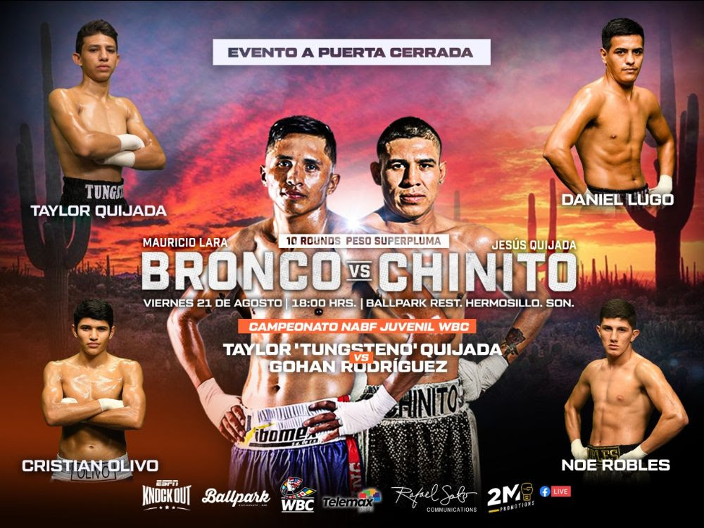 En el turno estelar, el hermosillense Jesús “Chinito” Quijada (16-6-2, 11 ko’s) se enfrentará al temido noqueador de la Ciudad de México Mauricio “Bronco” Lara (19-2-0, 13 ko’s) a 10 rounds en peso Pluma, en una pelea de alta trascendencia para ambos. El ganador, dejará de ser promesa para convertirse en realidad.