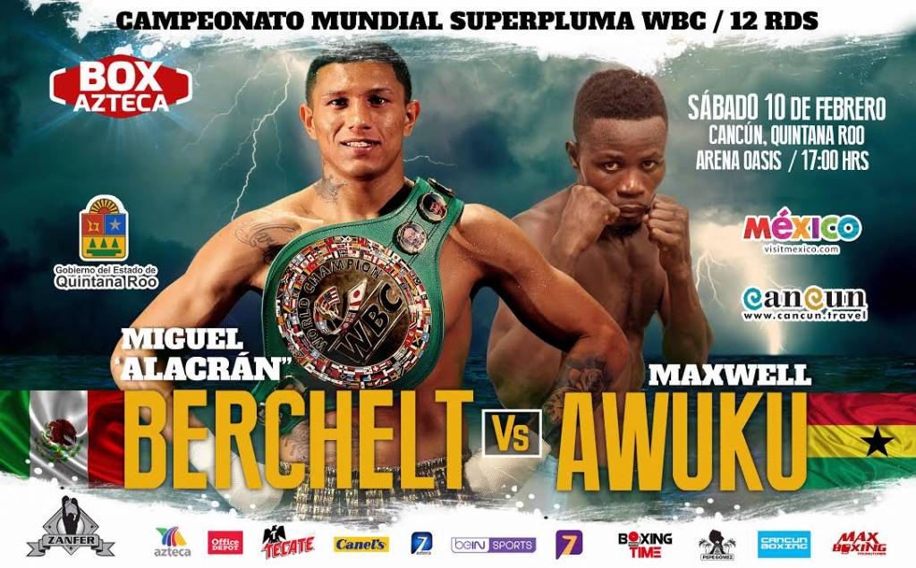 Con la emoción al tope y una condición física extraordinaria el campeón mundial Superpluma WBC Miguel ¨Alacrán¨ Berchelt hará la segunda exposición de su cinturón este sábado en su natal Cancún, Quintana Roo ante el peligroso retador Ghanés Maxwell Awuku en lo que será el combate estelar en la Arena Oasis en otra gran promoción de Zanfer, Max Boxing, Azteca 7, La Casa del Boxeo transmitirá a todo México y BeinSports en Estados Unidos.