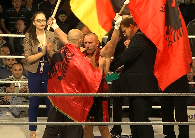 Thousands of Albanian fans came to support their local hero but couldn’t get into the open air Arena in Bulqize which had just been built up for this event. So the fight was broadcasted live on giant video walls outside of the stadium for the people in attendance who later on celebrated Keta’s victory with car parades and dancing in the streets.