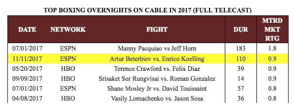 – En el Top Rank del 11 de noviembre, ESPN obtuvo dos de las ocho peleas mejor clasificadas para la televisión por cable en 2017.