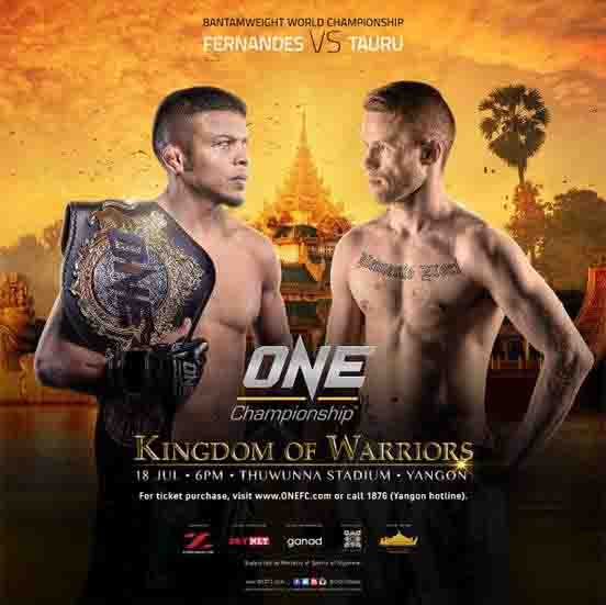 One_FC_Champion_Fernandes_Tauru19 June 2015 – Yangon, Myanmar: Asia’s largest and the world’s most exciting mixed martial arts organization, ONE Championship™ (ONE), has announced that on 18 July 2015, ONE: KINGDOM OF WARRIORS will take place at the Thuwunna National Indoor Stadium in Yangon, Myanmar. Fight fans will be treated to a night of world-class mixed martial arts action as ONE: KINGDOM OF WARRIORS will be headlined by a battle between current ONE Bantamweight World Champion, Bibiano “The Flash” Fernandes and a Finland’s Toni “Dynamite” Tauru. The card will also feature the best local and international mixed martial arts heroes.