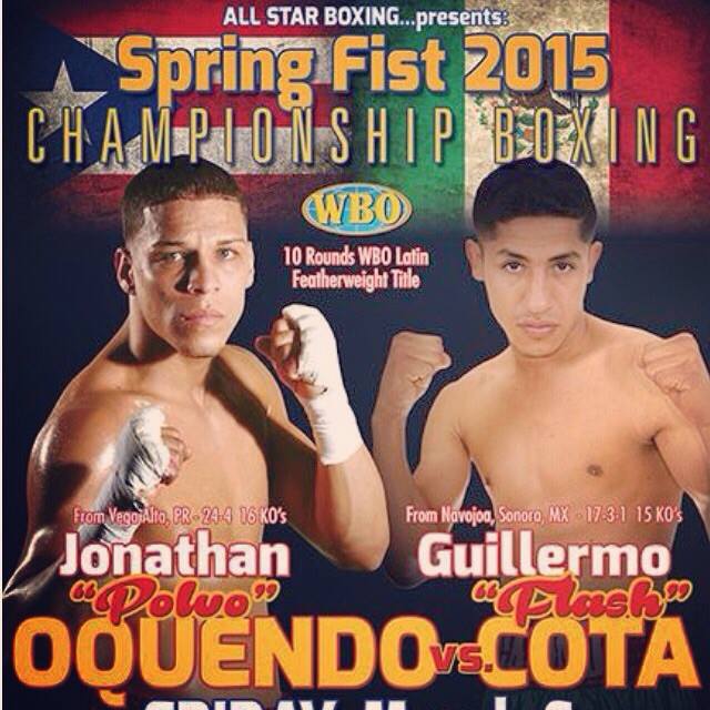 El encuentro de Oquendo (24-4, 16 KOs) frente a Cota (17-3-1, 15 KOs), para el que ambos marcaron 126 libras, será por el título vacante peso pluma (126 libras) Latino de la Organización Mundial de Boxeo (OMB).
