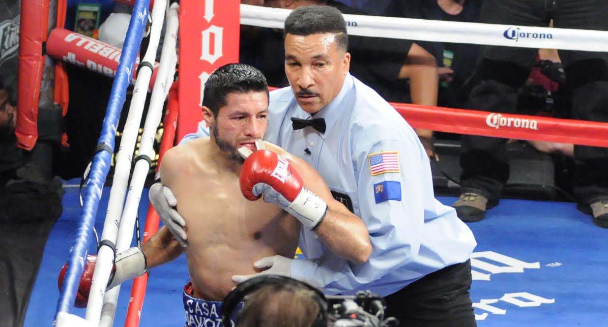 Al cierre del tercero Jhonny recibió un golpe en la barbilla que lo hizo perder el equilibrio y cayó de sentón para recibir el conteo de regla.