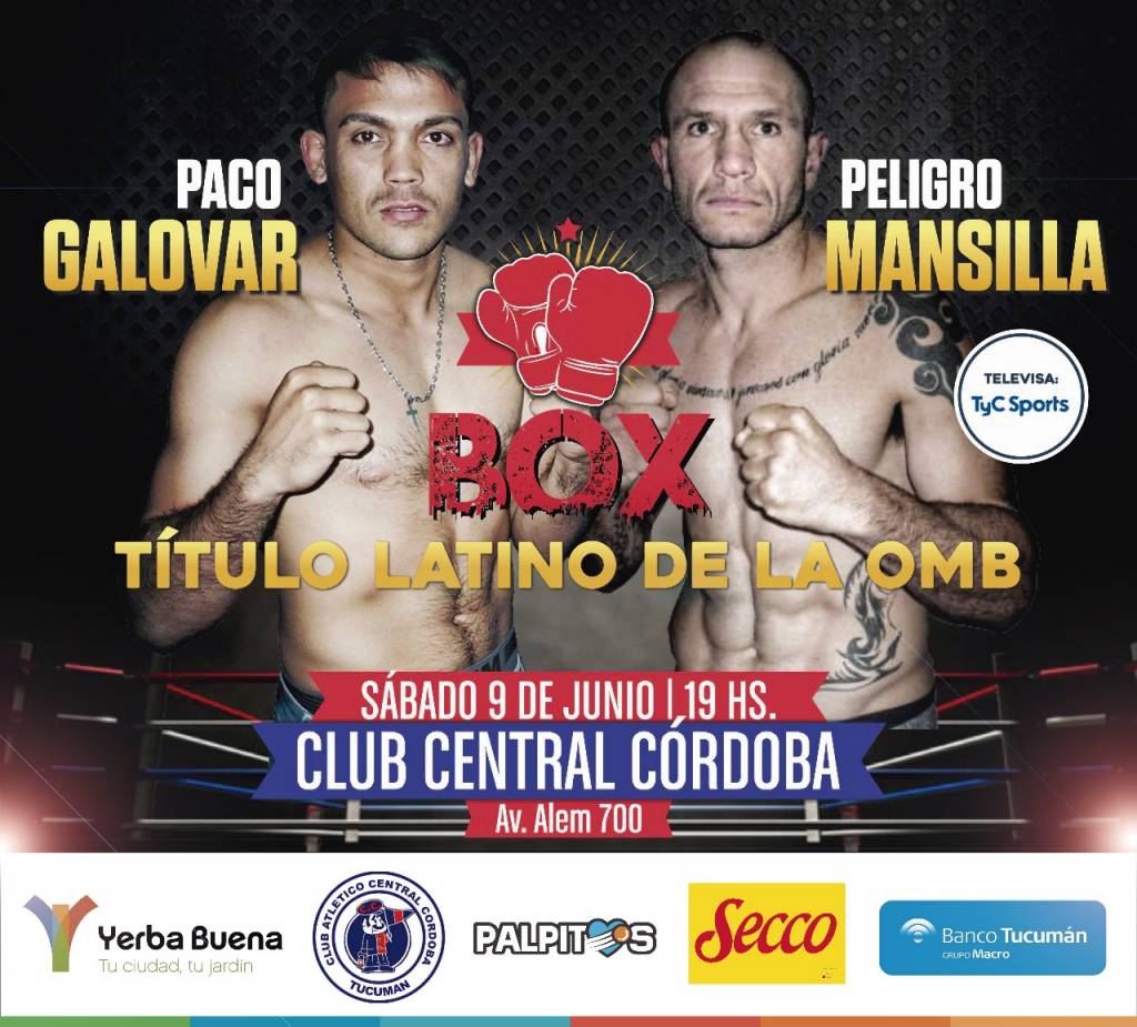 Un ascendente ídolo local tiene su gran chance. Frente a un aguerrido rival, se vivirá una fiesta desatando la “Explosión titular”. El ascendente y potente tucumano Facundo “Paco” Galovar se enfrentará al férreo entrerriano Wenceslao “Peligro” Mansilla, en disputa del título latino supermediano de la Organización Mundial de Boxeo (OMB), que se encuentra vacante, en el combate estelar de la velada que se desarrollará este sábado, 9 de junio, en el Club Atlético Central Córdoba, sito en Av. Alem 790, San Miguel de Tucumán, Tucumán, Argentina, en una nueva producción de Argentina Boxing Promotions, de Mario Margossian, que será transmitida en vivo a través de TyC Sports a partir de las 23, para Argentina y toda América.