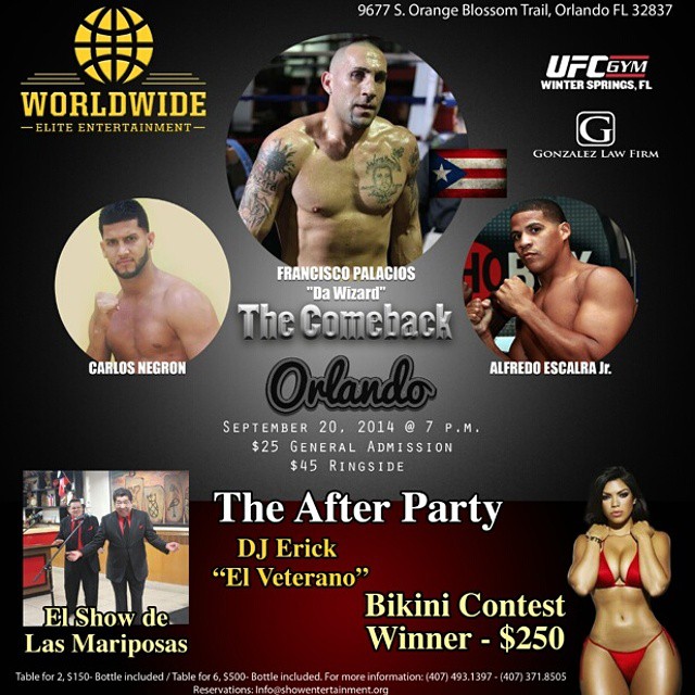 Promoted by World Wide Elite Entertainment, tickets are $25 for general admission, $45 to sit ringside and $500 for VIP tables of 6 with bottle service included. They’re on sale by calling 561-702-7068. All ticketholders over the age of 21 are invited to a special post-fight party hosted by DJ Erick at the Mela Room, located at 9677 S. Orange Blossom Trail in Orlando.