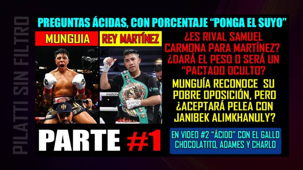 Primera Parte de nuestras ‘preguntas ácidas para respuestas con porcentaje’. ¿Qué pasará ahora con este Jaime Munguía que dice estar molesto y frustrado por la pobre oposición enfrentada? Vea si eso cambia algo y que porcentaje le otorgamos. A su vez, ¿qué esperar del Rey Martínez? ¿Dará el peso? ¿Es rival o no es rival el español Samuel Carmona? Tambien lo respondemos en este video y le damos doble calificación a lo que realmente creemos sobre esas dudas.
