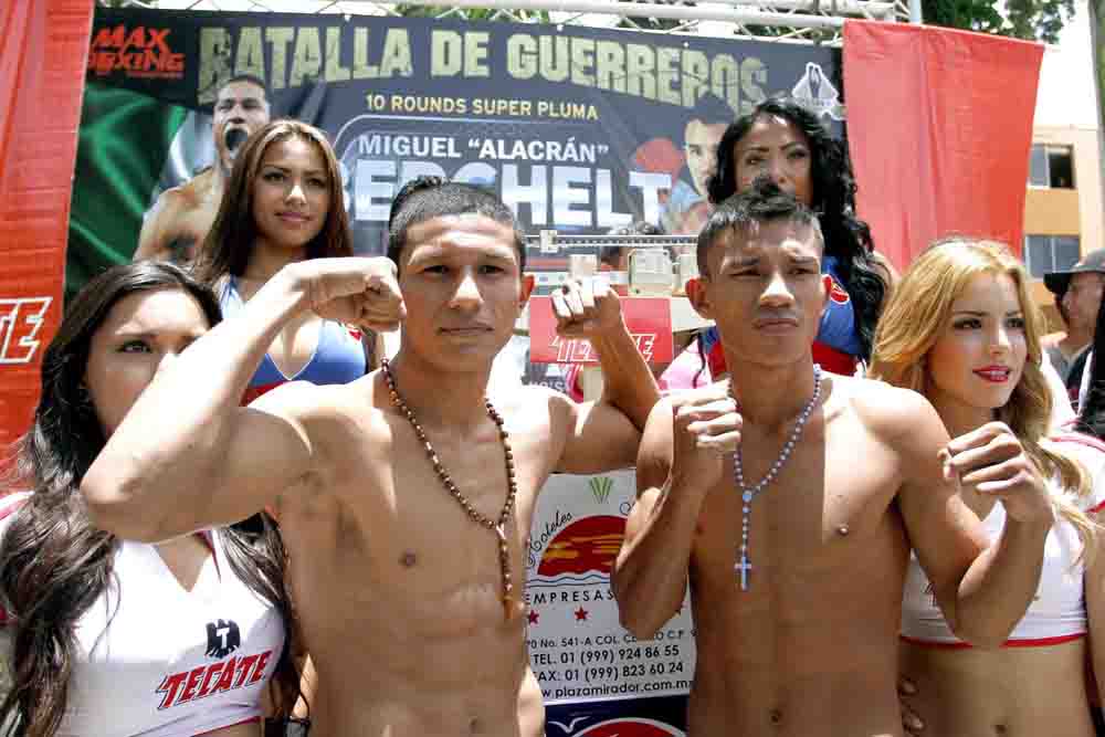Bajo la conducción del propio presidente de la Comisión de Box de Mérida (CBM), Santiago Basto Mejía, Berchelt y Haya fueron los primeros en trepar a la escala establecida en el límite pactado de los 58.960 kilos. El mexicano dio 58.900 kilos por 58.800 de su oponente asiático tras lo cual fueron aplaudidos por una multitud presente en el Hotel Plaza Mirador de esta ciudad, donde el sol fue un invitado inesperado y algo incómodo, sobre todo para los púgiles foráneos no acostumbrados a las temperaturas de esta ciudad que rondan los 40 grados.