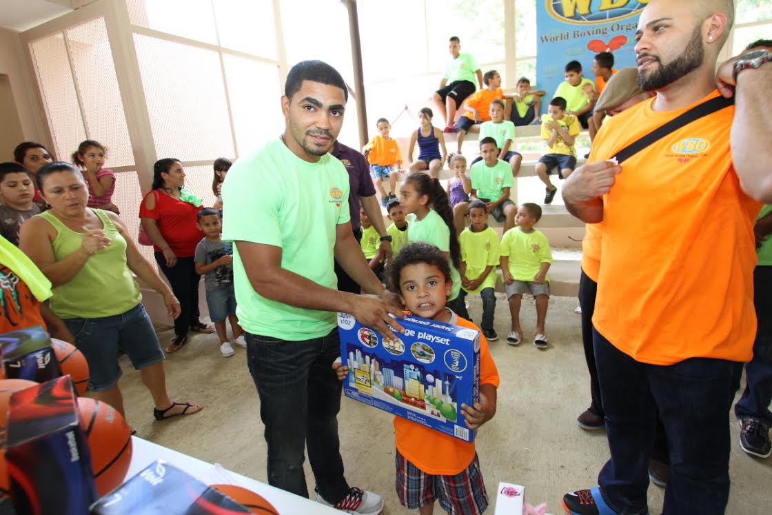 Los niños y jóvenes presentes recibieron regalos y compartieron con los ex campeones mundiales Samuel ‘El Torbellino’ Serrano y Alex ‘El Nene’ Sánchez (izquierda), el campeón N.A.B.O. pluma y primer clasificado Gamalier ‘Gammy’ Rodríguez, el prospecto peso supermosca José ‘Chiquiro’ Martinez (derecha) y la integrante de la Selección Nacional de Boxeo Aficionado de Puerto Rico, Mercedes Alicea.