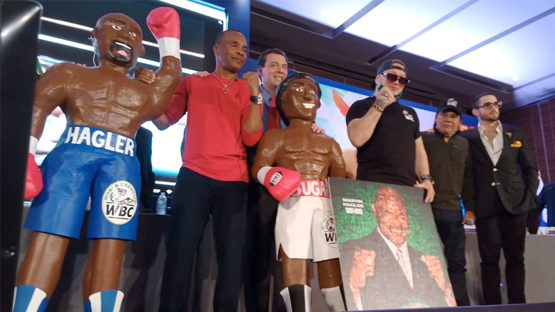 Era el Día de Ray en la Convención, pero también se le unieron en el escenario Roberto “Manos de Piedra” Duran, Vinny Paz y Donny lalonde. Se mostraron piñatas de los cuatro reyes Leonard, Duran, Hagler y Hearns. ¿Ray estaba algo perplejo de que el maniquí de Roberto se elevara sobre el suyo?