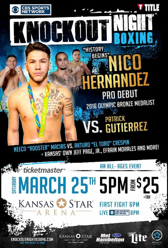 “Knockout Night Boxing: History Begins” will air live on CBS Sports Network. At 9:00 p.m. ET from Kansas Star Arena in Mulvane, Kansas. Knockout Night Boxing LLC is the licensed promoter of the March 25th event, in association with Kansas Star Casino, and it is sponsored by Miller Lite, Mel Hambelton FORD and TITLE Boxing.
