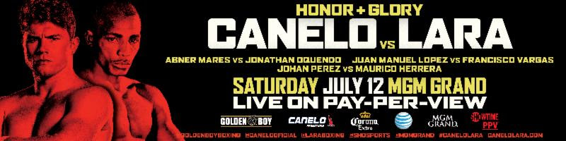 “Honor y Gloria: Canelo vs. Lara”, un combate a 12 asaltos en peso superwelter que se efectuará el sábado 12 de julio en el MGM Grand Garden Arena en Las Vegas, es promovido por Golden Boy Promotions y Canelo Promotions y patrocinado por Corona y AT&T. En el evento co estelar Abner Mares regresa para medirse a Jonathan “Polvo” Oquendo de Puerto Rico a 10 rounds en peso pluma. En la contienda de apertura por SHOWTIME PPV, Johan “El Terrible” Pérez defiende su cetro superligero interino de la AMB contra el retador Mauricio “El Maestro” Herrera en una cita a 12 asaltos. También se presentará el puertorriqueño Juan Manuel “JuanMa” López contra Francisco “El Bandido” Vargas de México a 10 asaltos por el cinto superpluma Internacional de la OMB en poder de López.