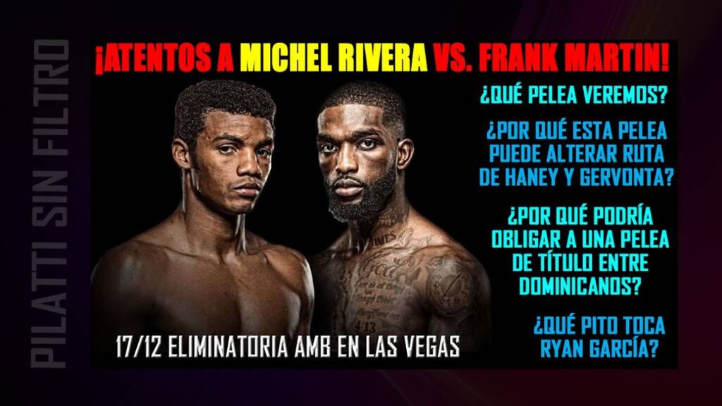 El peso ligero dominicano Michel Rivera (La Zarza Ali) encabeza el 17 de diciembre en Las Vegas una cartelera de PBC-Showtime. Enfrentara al también invicto Frank Martin en una eliminatoria de la AMB. O sea, durante 2023 el ganador tendrá una pelea ordenada contra Gervonta Davis o Devin Haney.