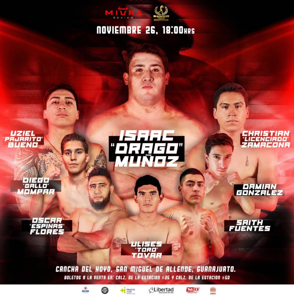 A tambor batiente, el invicto peso completo Issac “Drago” Muñoz buscará cerrar el año con triunfo, al encabezar el cartel que ofrece Miura Boxing, promotora que encabeza Manuel Garrido, en co-promoción con Rodrigo “Pato” Pacheco, con el apoyo de Libertad Soluciones de Vida, este sábado en la Cancha del Hoyo de San Miguel de Allende, Guanajuato.