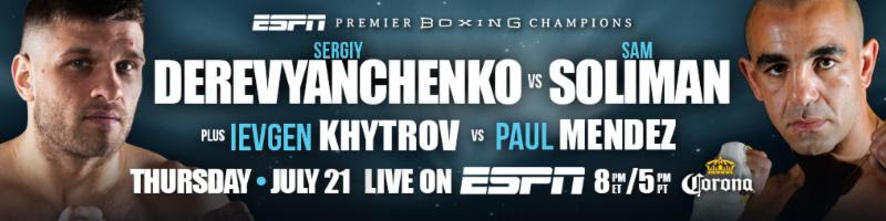 “On July 21, PBC on ESPN will feature two Ukrainian amateur prodigies and former Olympians who are now tearing through the middleweight division,” said Lou DiBella, President of DiBella Entertainment. “Sergiy Derevyanchenko, just eight fights into his pro career, will meet the experienced former champion Sam Soliman in a world title eliminator. The explosive Ievgen Khytrov, known as the ‘Ukranian Lion’, will open the telecast facing contender Paul Mendez in the toughest test of his career.”