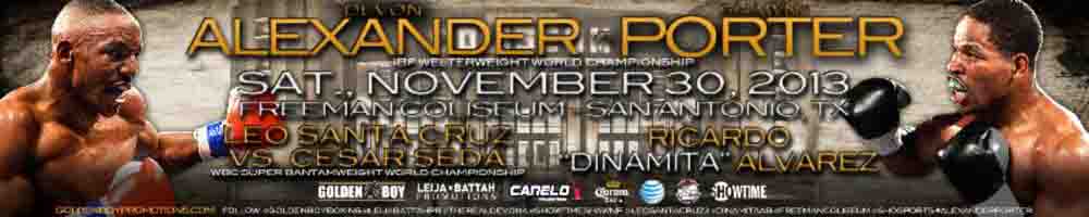 Alexander vs. Porter, una pelea a 12 asaltos por el campeonato mundial welter de la FIB en poder de Alexander, se llevará a cabo el sábado 30 de noviembre en el FreemanColiseum de San Antonio, Texas. El evento es promovido por Golden Boy PromotionsLeija*Battah Promotions y The Great Promotions, apoyado por los patrocinadores de Golden Boy Promotions Corona y AT&T. La transmisión de SHOWTIME comenzará a las 9:00 pmET/8:00 p.m./6:00 p.m. PT, y estará disponible en español a través de la programación de audiosecundario (SAP).
