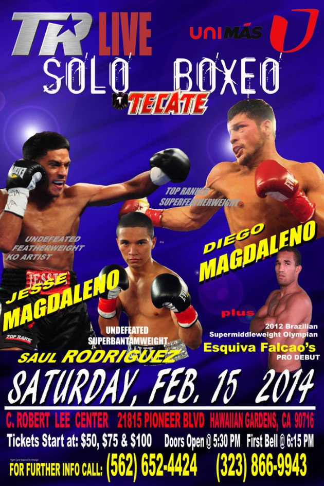 LOS ANGELES, California – Los hermanos Diego y Jesse Magdaleno estará en acción el sábado 15 de febrero en una nueva edición de “Solo Boxeo Tecate” que UniMás transmitirá desde el Robert E. Lee Activity Center de Hawaiian, Gardens, California.