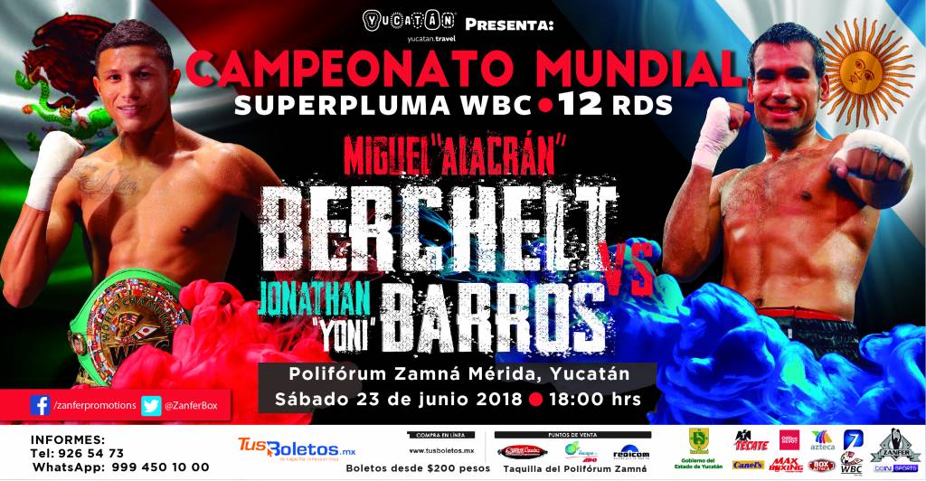El “Alacrán” Berchelt (33-1-0, 29 ko’s) expondrá por tercera vez su título mundial de las 130 libras reconocido por el Consejo Mundial de Boxeo, cuando se enfrente al argentino ex campeón mundial, Jonathan Víctor Barros (41-5-1, 22 ko’s) encabezando una espectacular función de Zanfer de Fernando Beltrán y Max Boxing de Mario Abraham que será transmitida a territorio nacional por la Casa del Boxeo, Azteca 7 y en Estados Unidos por ESPN.
