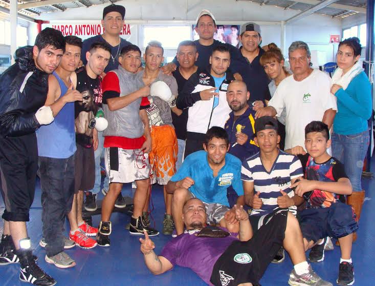 Tecuapetla, en medio con Jorge Barrera y “Churritos” Hernández y los demás boxeadores del Team Barrera, le desearon éxito al boxeador de Iztapalapa