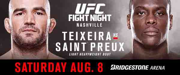PREUX_GLOVER TEIXEIRALas Vegas – The Octagon® will touch down in Tennessee for the fourth time on Saturday, August 8 with a battle of top-10 light heavyweights when fifth-ranked Glover Teixeira collides with former University of Tennessee football player, No. 6 Ovince Saint Preux. UFC FIGHT NIGHT®: TEIXEIRA vs. SAINT PREUX marks the promotion’s third trip to Nashville and first since January 2012.