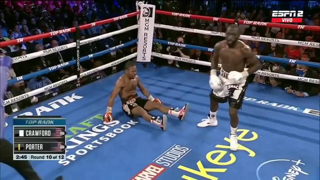 El séptimo vio acción cercana con Porter aterrizando en el interior y Crawford aterrizando desde el exterior. En los ocho, Porter consiguió varios derechos duros que parecieron molestar a Crawford. En el noveno, Crawford estaba lanzando bien al comienzo y obligando a Porter a retroceder. Crawford estaba haciendo mucho trabajo corporal. En el décimo, Crawford estaba acechando y atrapó a Porter cuando entró para anotar una caída. Porter se levantó, entró para intercambiar golpes con Crawford y fue derribado por segunda vez. Porter se levantó de nuevo, pero su esquina tiró la toalla para detener la pelea.