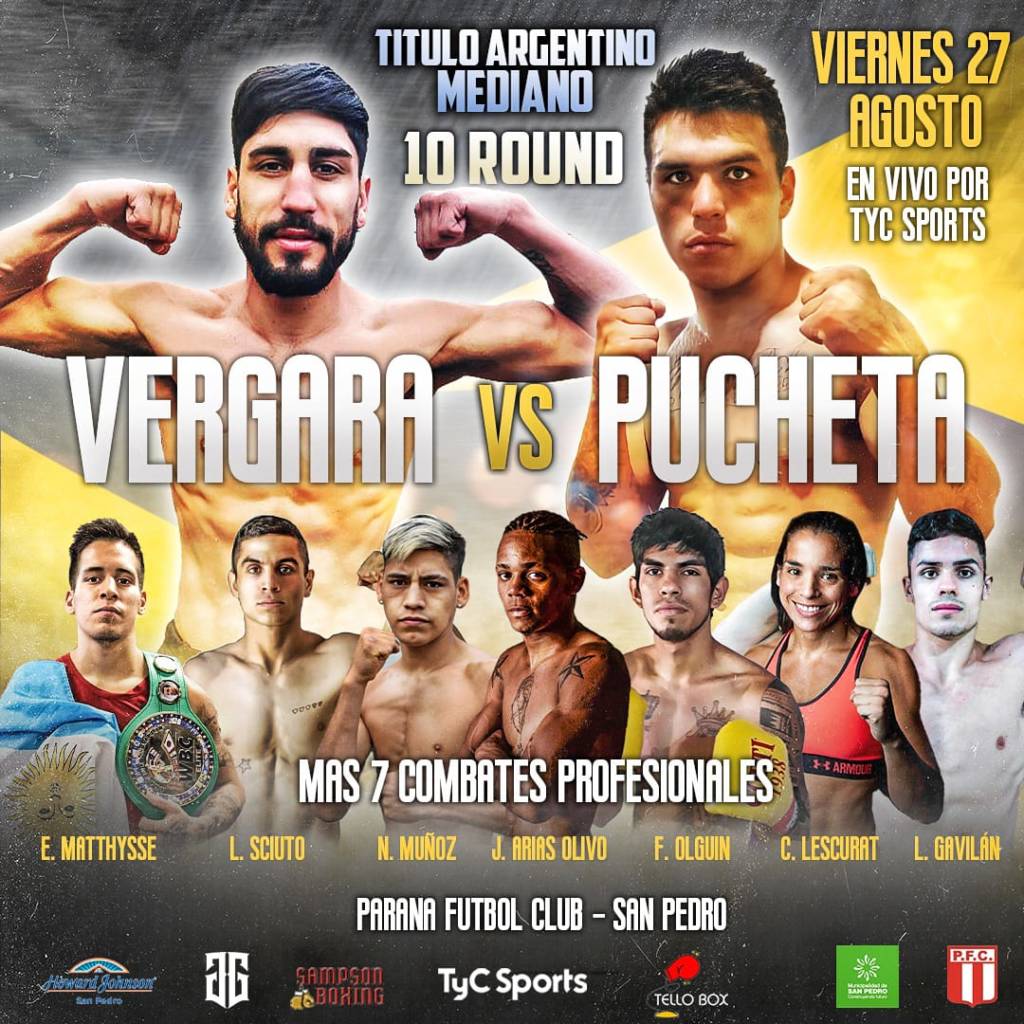 El campeón argentino de peso mediano, el santafesino Emiliano Pucheta, arriesgará ese título ante el peligro invicto bahiense Gerardo “Tifón” Vergara, en la más que atractiva pelea estelar de la velada a desarrollarse este viernes 27 de agosto en el Paraná Fútbol Club, de San Pedro (Buenos Aires), en otra producción de Sampson Boxing y Tello Box.